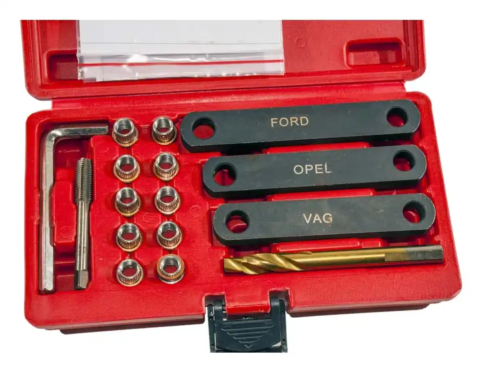 Féknyereg vezetőcsap menetjavító készlet, 16 darabosEz a készlet időt és pénzt takarít meg, segítségével akár a lengőkar cseréje is elkerülhető.3 db pozícionáló lemezének köszönhetően számos járműhöz kompatibilis.A lépcsőzetes fúró segítségével tágítsa ki a menetet, hogy aztán könnyedén behelyezhesse az új betéteket.A speciális pozícionáló lemezek használata biztosítja a merőleges, precíziós fúrást.Ha szükséges, a menetmetsző segítségével kijavíthatók a menet kisebb hibái.Menetméret: M9x1.25mmAlkalmazhatóság: VAG, GM, Ford Például:VW Golf MKIV/BeetleSeat Exeo Estate ST170Ford Focus/C-MaxOpel Astra-GA készlet tartalma:1 db speciális lépcsős magfúró1 db speciális M9x1.25mm-es menetfúró (menetjavító)3 db pozícionáló lemez: VAG (furatok központi távolsága 90mm), Opel (furatok központi távolsága 94mm), Ford (furatok központi távolsága 105mm)10 db M9 x 1.25 mm-es menetbetét rézgyűrűvelL-alakú imbuszkulcs (7mm)Piros műanyag tároló táskában szállítva (220x115x55mm).