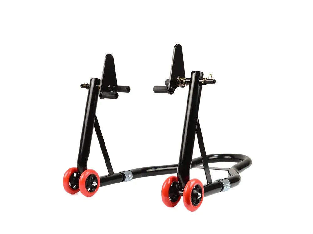 Motorkerékpár első emelőállvány egy strapabíró, megerősített acél szerkezetű eszköz, amelyet a motorkerékpár első tengelyének biztonságos megemelésére terveztek. A 32 mm átmérőjű, porfestett acélcsőből készült váz extra stabilitást biztosít akár műhely-, akár otthoni karbantartáshoz.A kiváló minőségű ABS-ből készült kerekek gördülékeny mozgást és hosszú élettartamot garantálnak, míg az állítható tartópofák (150–260 mm belső távolság) különböző motorokhoz is alkalmazhatóvá teszik. A 270 kg teherbírású konstrukció biztonságosan tartja a motort a kívánt pozícióban. Jellemzők:Teherbírás: 270 kgAnyag: megerősített, porfestett acélCsőátmérő: 32 mmMagasság: 350 mmÁllítható belső tartótávolság: 150–260 mmKerekek: tartós, simán gördülő ABS műanyagElső kerék emeléshez tervezve