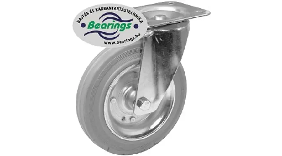 L400.B56.200 Talpas, forgóvillás szállítókerék. Cinkkromátozott acéllemez villa, avilla forgórészében két golyósor biztosítja az irányváltoztatást.Keréktest: Acél, porvédővel. Futófelület: szürke gumi. Csapágyazás:…