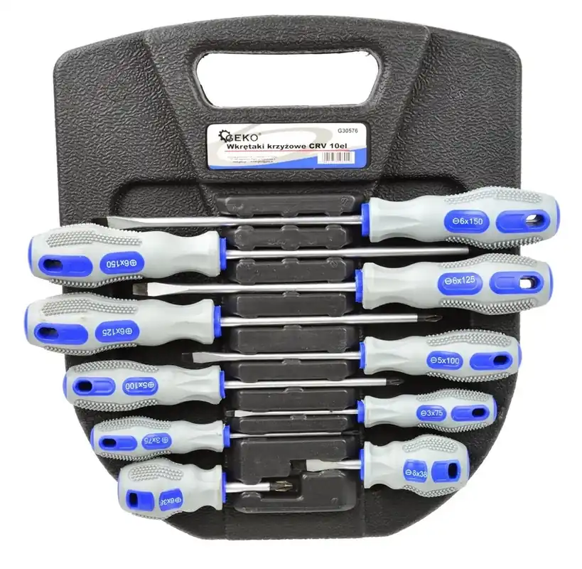 Professzionális 10 részes csavarhúzókészlet, króm-vanádium acélból (CrV) , ami rendkívül tartóssá teszi őket. A készlet kétféle csavarhúzót (keresztfejű, laposfejű) tartalmaz, különböző méretben.kiváló minőségű CrV acélból készült csavarhúzó készletkétféle csavarhúzó (keresztfejű, laposfejű) – összesen 10 db.mágneses csavarhúzó hegyekKétkomponensű, ergonomikus fogantyú, háromszög keresztmetszetű