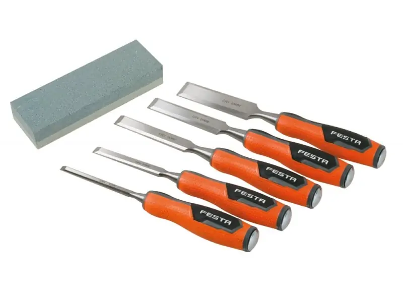FESTA vésőkészlet 5 db-os kiszerelés egy darab fenőkővel és ergonomikus műanyag nyéllel, feltűnő felülettel.A penge teljes hosszában edzett CrV acélból van kovácsolva.