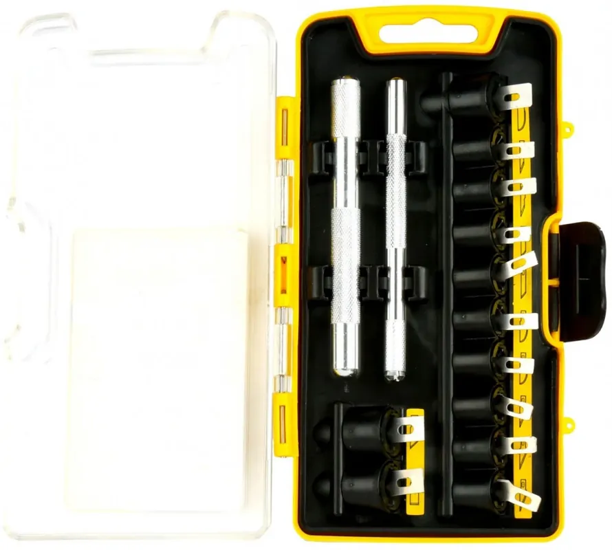 Kétfajta késtartó nyél12 fajta penge a különböző anyagok pontos vágásához, és sorjázásáhozBiztonságos tartódoboz pengéknek és a nyeleknekCsak szimplán csúsztassa a pengét a tartónyélbe forgassa el és biztonságosan tudja használni