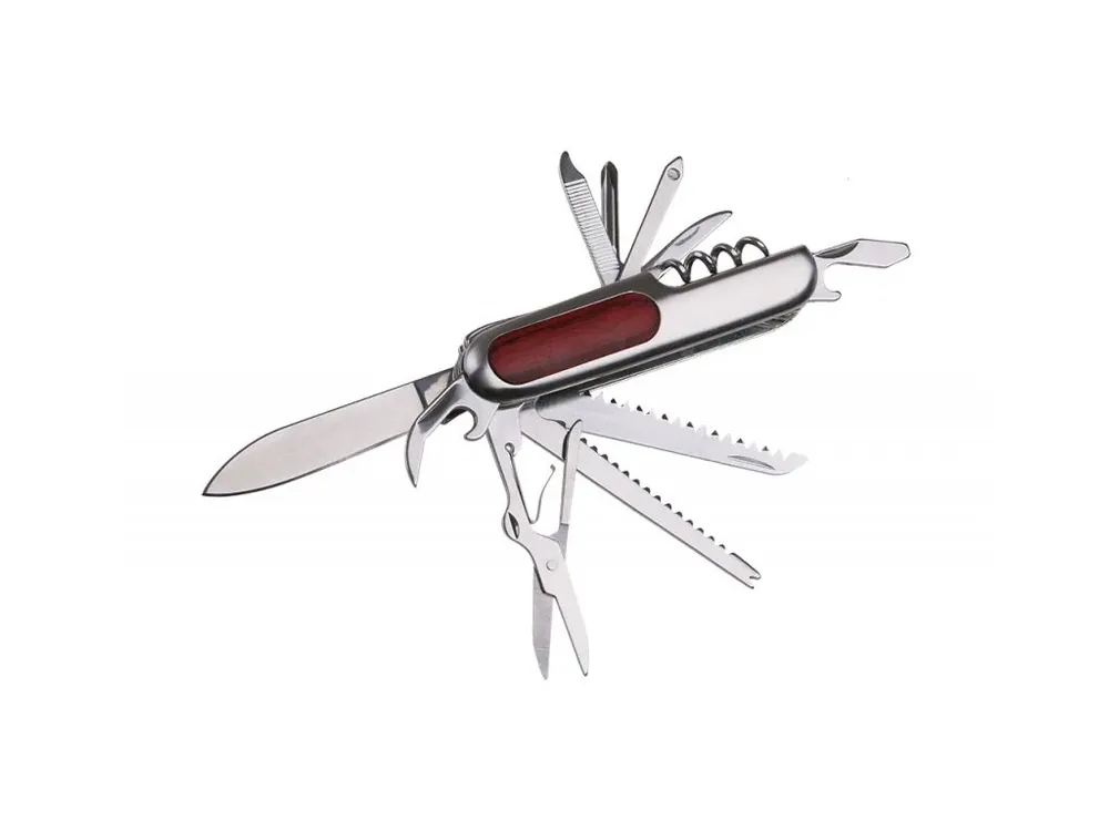 Rozsdamentes acél multifunkcionális kés 11 különböző résszel, különböző felhasználási célokra. A fogantyú fém és fa kombinációja