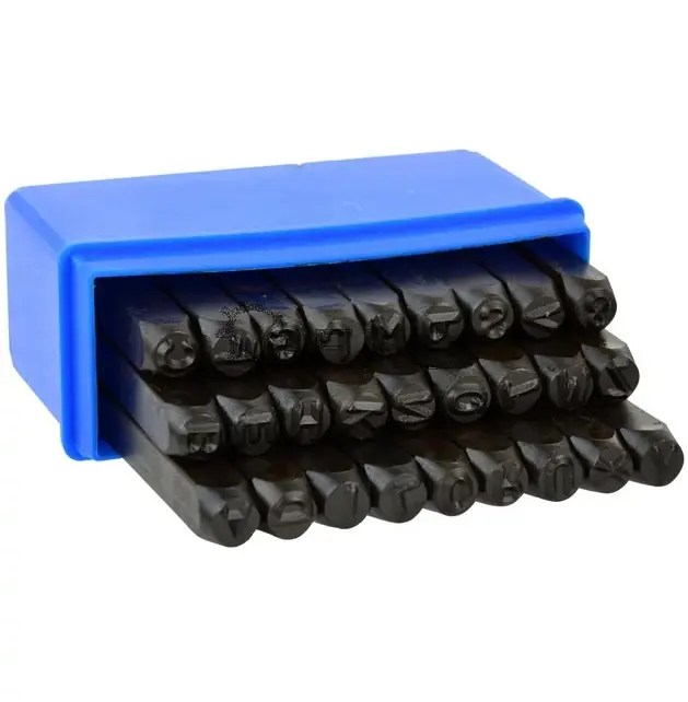 27db-os teljes ABC betűit tartalmazó betű beütőkészlet. A betűk 6mm magasak. A betűkön kívül &-jelet is tartalmaz a készlet. Praktikus műanyag tárolóban. Alkalmas fémekben való szövegek megjelenítésére, táblák készítésére.