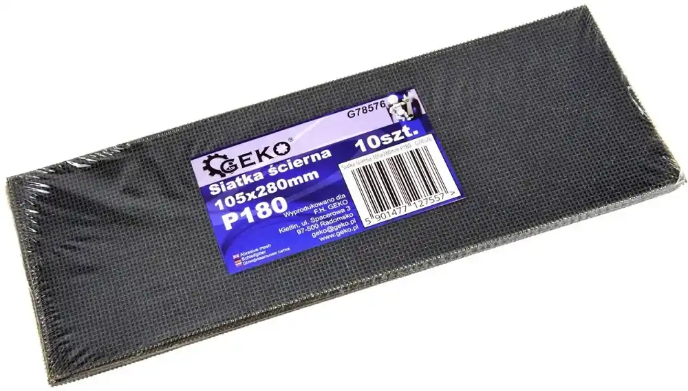 Geko csiszolóháló A 10 darabos készlet pótolhatatlan eszköz a belsőépítészettel foglalkozók számára. Alkalmas felületek festésre, tapétázásra való előkészítésre. A csiszolóháló ideális vakolat, gipszkarton felületkezelésére. Mindkét oldala használható.Kézi csiszolóval való használatra. Szilícium-karbid bevonatú háló.A P180 szemcseméret biztosítja a vakolat végső simítását, befejező megtisztítását.