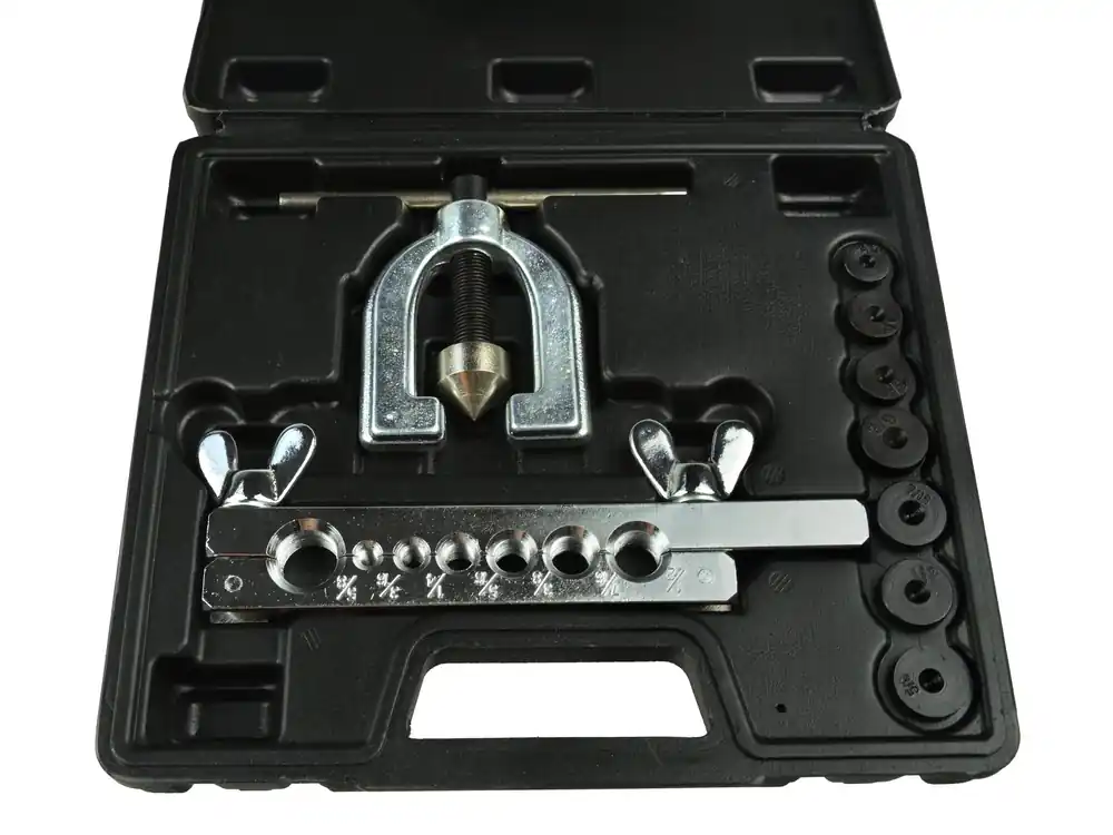 Dupla cső peremező szerszámkészlet, 10 db-os. Alkalmas réz-, alumínium-, magnézium- és sárgaréz csövekből, valamint puha acél (max. 1mm vastag) csövek dupla peremének elkészítésére. Járművek fékcsövéhez, hűtő, fűtő csövekhez.Átmérők: 3/16″, 1/4″, 5/6″, 3/8″, 7/6″, 1/2″, 5/8 „. A készlet tartalma:7 adapter (tüske átmérő: 2,42 mm, 3,44 mm, 5 mm, 6,46 mm, 7,96 mm, 9,44 mm, 12,40 mm)1 peremező prés1 peremező szorító (lyukátmérők: 4,76 mm, 6,35 mm, 9,52 mm, 12,7 mm, 15,8 mm, 21,16 mm, 29,63 mm)1 markolatKoffer