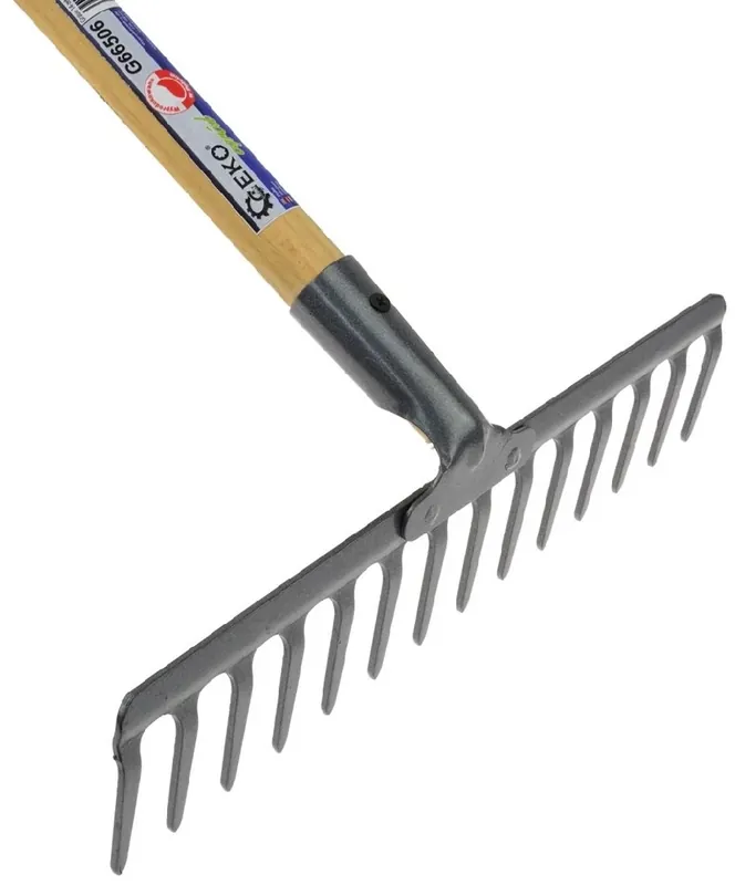 Geko gereblye Talajegyengetésre, -lazításra, avargyűjtésre, növények betakarására, otthoni használatra.Nagy szilárdságú, acél gereblye fej, ellenáll a deformációnak.Fából készült, simára csiszolt fa nyél.Szegeccsel rögzített fej.