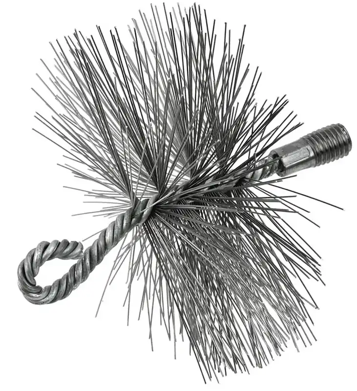 Geko kéménytisztító drótkefe Ez a kéménykefefej ideális eszköz a kerámia kémények hatékony tisztításához a koromtól és egyéb lerakódásoktól.A sörték kiváló minőségű acélból készülnek, amely még gyakori használat mellett is nagy ellenállást biztosít.A felhasznált fém drót korrózióálló és tartós. A szálak sűrűn és egyenletesen helyezkednek el, ezzel biztosítva a hatékony tisztítási folyamatot. Az alsó oldalon a kefe M12-es menettel rendelkezik nyél vagy súly felcsavarásához, míg a felső oldalon van egy fűzőlyuk a karabinerhez vagy egy drótkötél kampóhoz való rögzítéshez.Ez az acélkefe nélkülözhetetlen segítség a professzionális kéményseprőknek és azoknak a felhasználóknak, akiknek megbízható szerszámra van szükségük a kéményrendszerek karbantartásához.