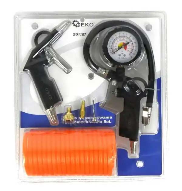 Pneumatikus készlet szivattyúzáshoz és fújáshoz szivattyúhegyekkel és 5 m-es pneumatikus tömlővel.A fúvópisztoly minden professzionális műhelyben és otthoni garázsban szükséges eszköz. A fegyver kényelmes, könnyű és praktikus. A fúvópisztoly ideális a szennyeződések eltávolítására zugokból, nehezen elérhető lyukakból, valamint víz kifújására a résekből.A nyomásmérővel ellátott pneumatikus gumiabroncs-felfújó pisztoly minden garázsban szükséges eszköz. A fegyver kényelmes, könnyű, praktikus és esztétikus. A pisztoly légtelenítő szeleppel és gumi nyomásmérő burkolattal rendelkezik. 5 m hosszú pneumatikus tömlőt használnak minden pneumatikus szerszám táplálására. Poliuretánból készült, így rugalmas, puha és tartós. Három darabból álló készlet golyók, matracok, kerekek, játékok stb. felfújásához.Szivattyús pisztolyFelfújó pisztoly tömlő hossza: 350 mmNyomásmérő skála (működési tartomány): 0 – 15 bar / 0 – 220 psi / 0 – 1500 kPaGyorscsatlakozó mérete: 1/4″Fúvó pisztolyMax. a fúvópisztoly üzemi nyomása: 8 barA fúvóka átmérője: 2 mmGyorscsatlakozó mérete: 1/4″Pneumatikus tömlőPneumatikus kábel hossza: 5 mKábelátmérő: belső 6 mm / külső 8 mmMaximális üzemi nyomás: 8 barAnyaga: poliuretánGyorscsatlakozó típusa: anya 1/4″, apa 1/4″