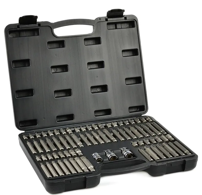 CrV acélból készült bitkészlet speciális csavarok kicsavarásához, mint pl.: torx, spline, hatlapú borda. A bitek nagy választékának köszönhetően ez a készlet tökéletes professzionális autószervizekhez és műhelyekhez.króm-vanádium acél (CrV) készlettorx, spline, hatlapú, bordás bitek különböző méretekbenadapter 1/2″-os foglalattal (2 db) és 3/8″-os aljzattal 10 mm-es bitekhezA készlet tartalma:Aljzat 1/2″-os aljzattal 10 mm-es bitekhezAljzat 3/8″-os aljzattal 10 mm-es bitekhezTORX 75 és 30 mm: T20 / T25 / T30 / T40 / T45 / T50 / T55 / T60TORX 75 és 30 mm-es furattal: TT20 / TT25 / TT30 / TT40 / TT45 / TT50 / TT55 / TT60SPLINE 75 és 30 mm: M5 / M6 / M8 / M10 / M12HEX (hatszögletű) 75 és 30 mm: H4 / H5 / H6 / H7 / H8 / H10 / H12RIBE 75 és 30 mm: R5 / R6 / R7 / R8 / R9 / R10 / R12 / R14