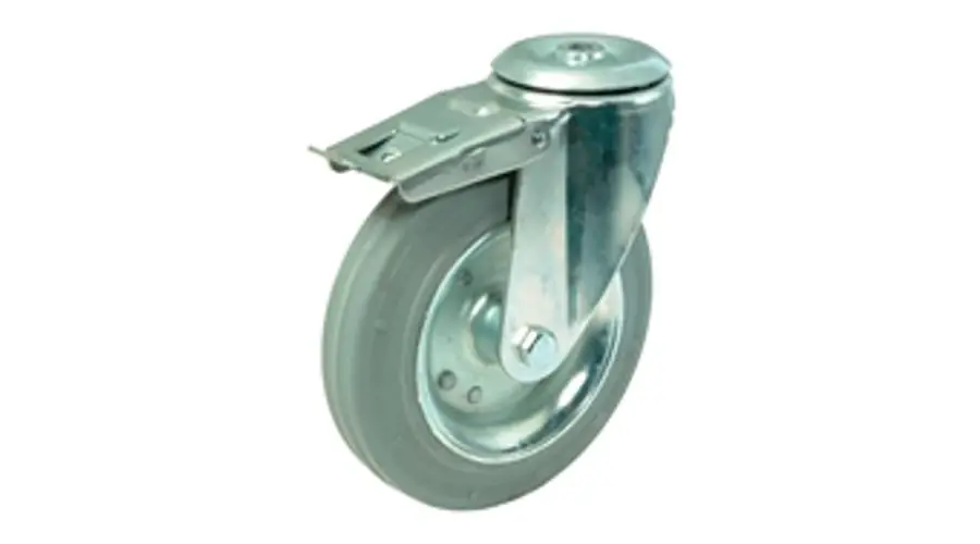 L121.B56.100 Katalógus oldal: 116Hátfuratos, forgóvillás fékes szállítókerék.Cinkkromátozott acéllemez villa, a villa forgórészében két golyósor biztosítja az irányváltoztatást.Keréktárcsa: horganyzott acél, futófelület:…
