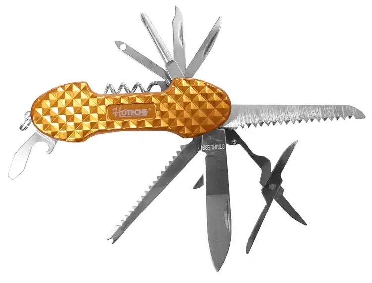 Hoteche multifunkciós bicska A Hoteche multifunkciós bicska olyan kés, amely számos beépített eszközt és funkciót tartalmaz.Ezen bicska kialakítása lehetővé teszi, hogy számos feladatot hajtsunk végre egyetlen eszközzel, például vágást, csavarhúzást, konzervnyitást és még sok egyebet.Ezek a funkciók rendkívül praktikusak a mindennapi életben, kempingezés vagy túrázás alkalmával.Kompakt és könnyen hordozható.Magas minőségű alumínium ház.2Cr13 rozsdamentes acélból készültek a szerszámok.Funkciók:1db kés1db fűrész1db sörnyitó1db olló1db konzervnyitó1 db csillagcsavarhúzó1 db körömreszelő1 db jégtörő1 db horgászkés1 db tű1 db bornyitó
