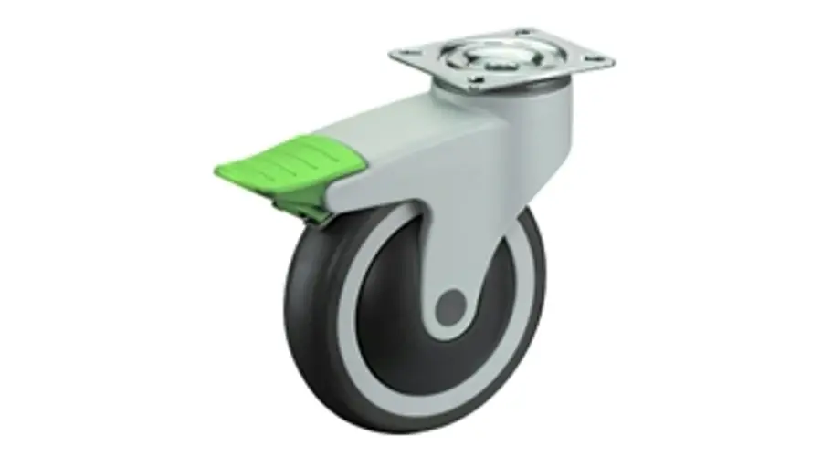 C130.A82.125Katalógus oldal: 99Talpas, forgóvillás, totál fékes készülékkerék. Műanyag villa, a forgórészben görgősorral szerelt. Keréktest műanyag, fekete pórvédővel,futófelület: szürke gumi. Csapágyazás: golyóscsapágy….