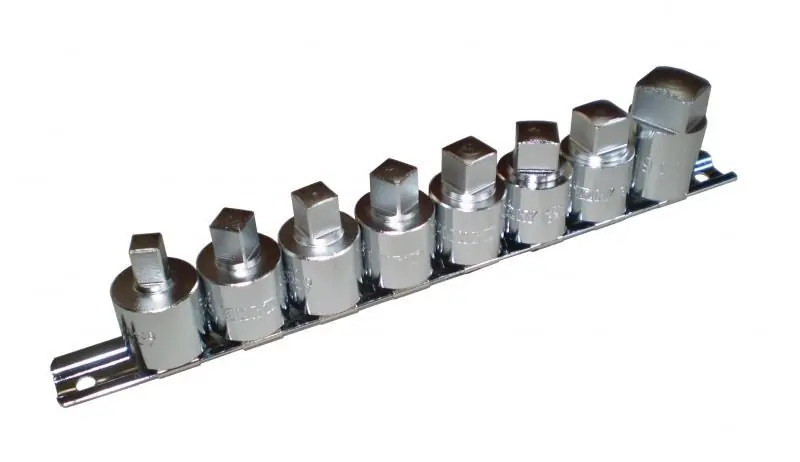 JELLEMZŐK:-1 / 2 „meghajtó oldal-Négyszög bitfej-Anyaga: króm-vanádium ötvözött acél-Felületkezelés: krómozott, polírozott,-DIN 3120 szabvány szerintTECHNIKAI SPECIFIKÁCIÓK:8 db-osMéretek a 4014-es adapter fejekből: 8, 9,5, 10, 10.5, 12, 12,7, 13,5, 19 mm1 / 2 „-os befogási mérettel230mm hosszú tartósínen, klipszeken