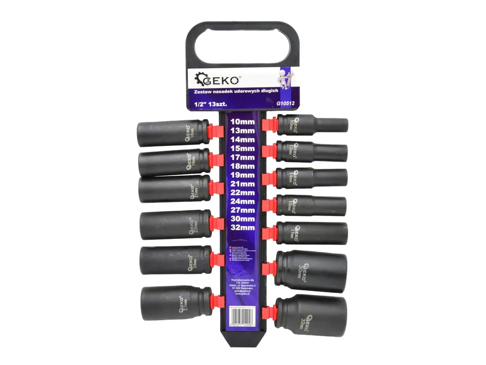 Geko gépi dugókulcs készletA dugókulcsok (dugófejek) jellemzően valamilyen hajtószárra vagy toldó adapterre tűzhető szerszámfejek. Segítségükkel könnyen meghúzhatóak, illetve meglazíthatóak a járművek különböző csavarai, csatlakozói. Ez a készlet gép meghajtáshoz használható.A készlet ellenálló és korróziótól védett róm-vanádium acélból készült.Kitűnő választás szakemberek számára.Foszfát kikészítés.Praktikus műanyag tartóval szállítva, mely könnyen felakasztható a műhelyben bárhol.Négyzet alakú meghajtás, 1/2″Fej 6 oldalú.75 mm hosszú kialakításA készlet tartalma: 13 db dugókulcs: 10, 13, 14, 15, 17, 18, 19, 21, 22, 24, 27, 30, 32 mm