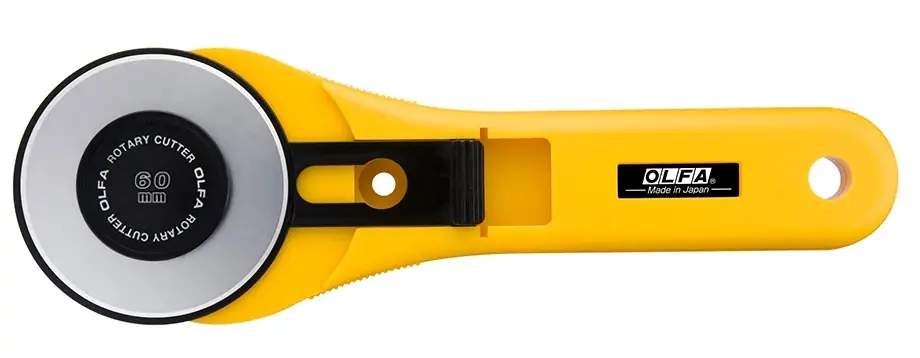 60 mm-es, hosszú élettartamú, RB-60H körpengével szerelt foltvarró / patchwork kés.Alkalmas több réteg szövet vágásához.Jobb- és balkezes felhasználók számára egyaránt használható.Kényelmes széles markolat és könnyű pengecsere jellemzi.A sérülések elkerülése érdekében műanyag pengevédővel.