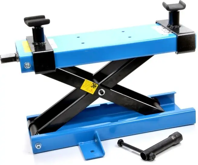 Lecsavarozható motor emelő mini lift, ollós emelő szerkezettel, orsós hajtással maximálisan 500 kg emelési kapacitással, maximum 40 cm magasságig.Az emelő teljesen összecsukott állapotban minimális magasságú.Az emelőn 2db tartóbak található. A tartóbakok pozíciója állítható.