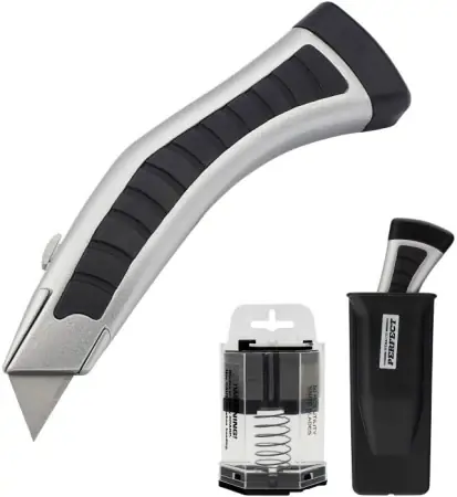 profilozott alumínium test csúszásgátló bélésselműanyag tok övtartóval50 trapéz alakú penge egy kényelmes tárbantárolórekesz a használt pengék számára a tár alsó részében