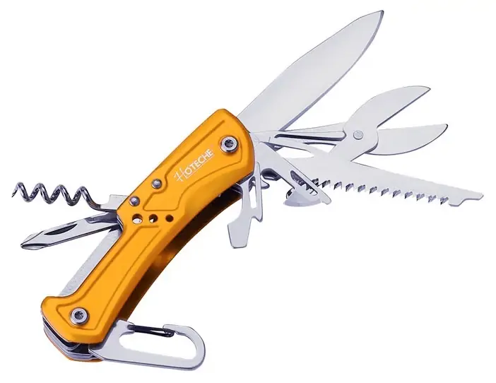 Hoteche multifunkciós bicska A Hoteche multifunkciós bicska olyan kés, amely számos beépített eszközt és funkciót tartalmaz.Ezen bicska kialakítása lehetővé teszi, hogy számos feladatot hajtsunk végre egyetlen eszközzel, például vágást, csavarhúzást, konzervnyitást és még sok egyebet.Ezek a funkciók rendkívül praktikusak a mindennapi életben, kempingezés vagy túrázás alkalmával.Kompakt és könnyen hordozható.Magas minőségű alumínium ház.2Cr13 rozsdamentes acélból készültek a szerszámok.Funkciók:1db kés1db fűrész1db sörnyitó1db olló1db konzervnyitó1 db csillagcsavarhúzó1 db bornyitó