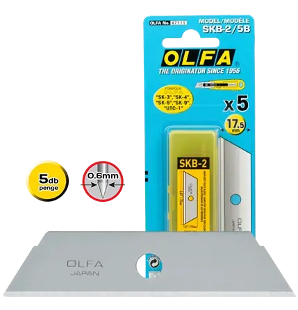 Pengeméret 17,5 mmPengevastagság 0,6 mmPenge / csomag 5 dbKét oldalas fix penge.AlkalmazhatóSK-4SK-5SK-9UTC-1 tipusú késekhez.