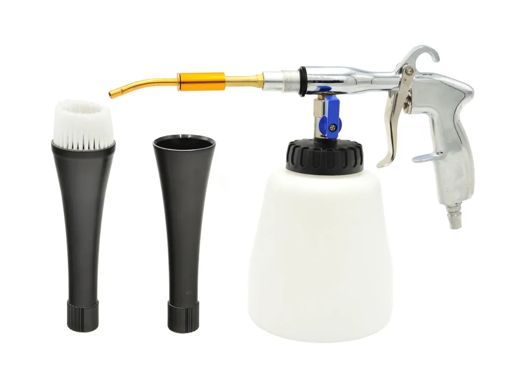 Levegőtisztító mosópisztoly fém fúvókával. Alkalmas gyapjú autókárpitok, bőr autókárpitok, műszerfal, kormány, ajtólapok, szőnyeg, padlószőnyeg, autótető, motorfelület, abroncs felülete, kerékfelület tisztítására.Fém fúvóka – ideális kereskedelmi alkalmazásokhozTartós fém konstrukcióKémiai beállítás