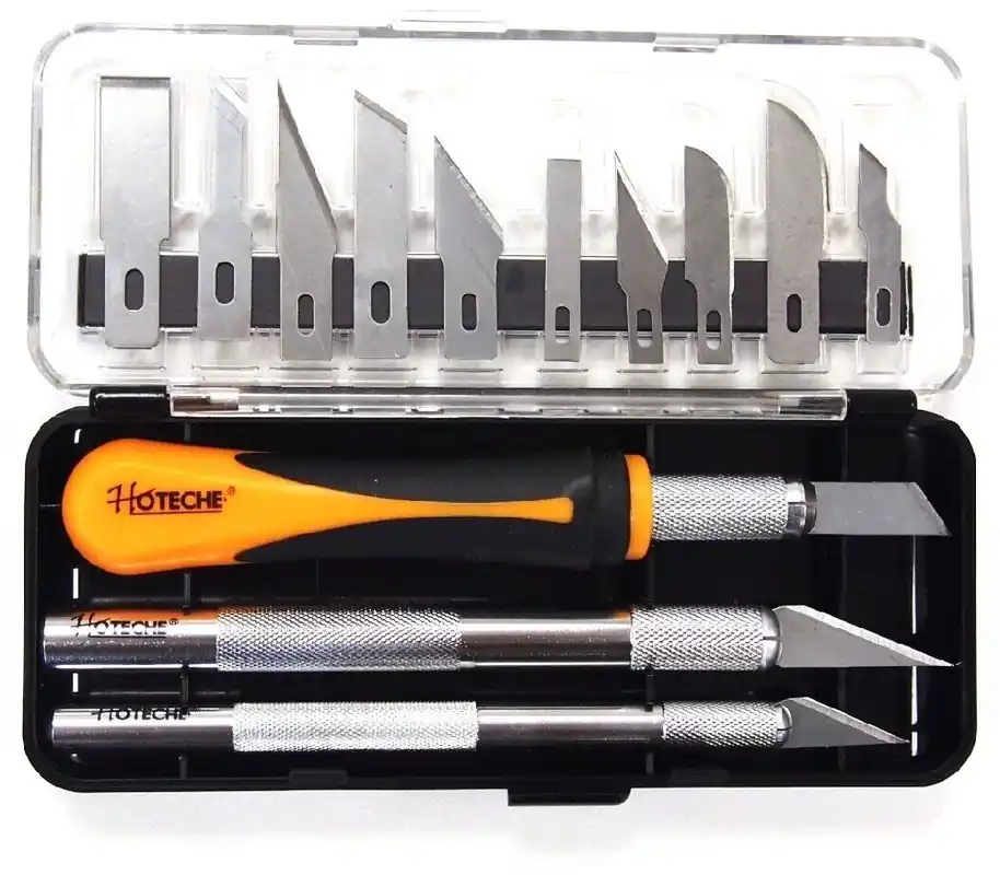 Hoteche precíziós kézműves késkészlet Precíziós kézműves késkészlet, alumínium, csúszásmentes markolattal.13 részes késfejet tartalmaz a készlet, melyek gyorsan és egyszerűen cserélhetők. Ezáltal a legkülönbözőbb feladatokra alkalmasak szükség szerint.A készlet tartalma:1 db 120 x 8 mm alumínium ötvözetű markolat1 db 120 x 11 mm alumínium ötvözetű markolat1 db ABS+TPR borítású markolat13 db SK5 penge