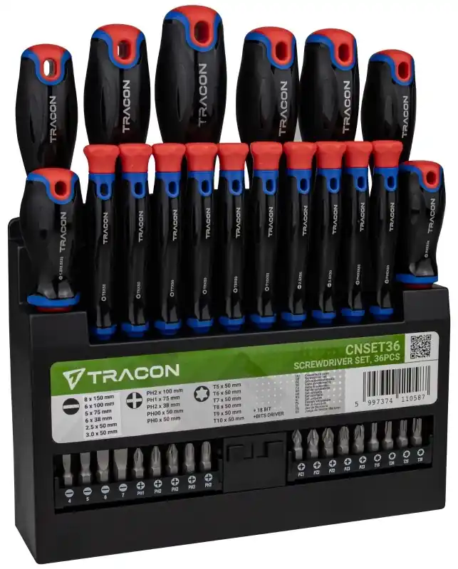 A Tracon CNSET36 Diamond csavarhúzó-készlet 36 darabos szett, amely széles méret- és fejválasztékot kínál: lapos, Phillips és Torx csavarhúzókat tartalmaz. A szerszámok króm-vanádium (CrV) acélból készülnek, Diamond felülettel, így hosszú élettartamot és biztos tapadást nyújtanak. Kiváló választás szakembereknek és hobbi felhasználóknak egyaránt. Főbb jellemzők:36 darabos készlet többféle fejjelDiamond felület a jobb tapadásértAnyag: króm-vanádium (CrV) acél2-komponensű markolat a kényelmes fogásértPrecíz kialakítás és hosszú élettartam Felhasználás:Lapos, Phillips és Torx csavarok meghúzásáraSzerelési, karbantartási és javítási munkákProfesszionális és otthoni projektekhez egyaránt A készlet tartalma:Phillips (PH)LaposTorx (T)PH3 × 150 mmPH2 × 100 mmPH1 × 100 mmPH1 × 75 mmPH2 × 38 mmPH0 × 50 mm8 × 150 mm6 × 100 mm5 × 100 mm5 × 75 mm3 × 50 mm3.0 × 50 mmT5 × 50 mmT6 × 50 mmT7 × 50 mmT8 × 50 mmT9 × 50 mmT10 × 50 mm