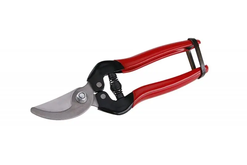 Szüretelő olló hajlított pengéjű.Gumírozott, ergonómiai alakú nyéllel.