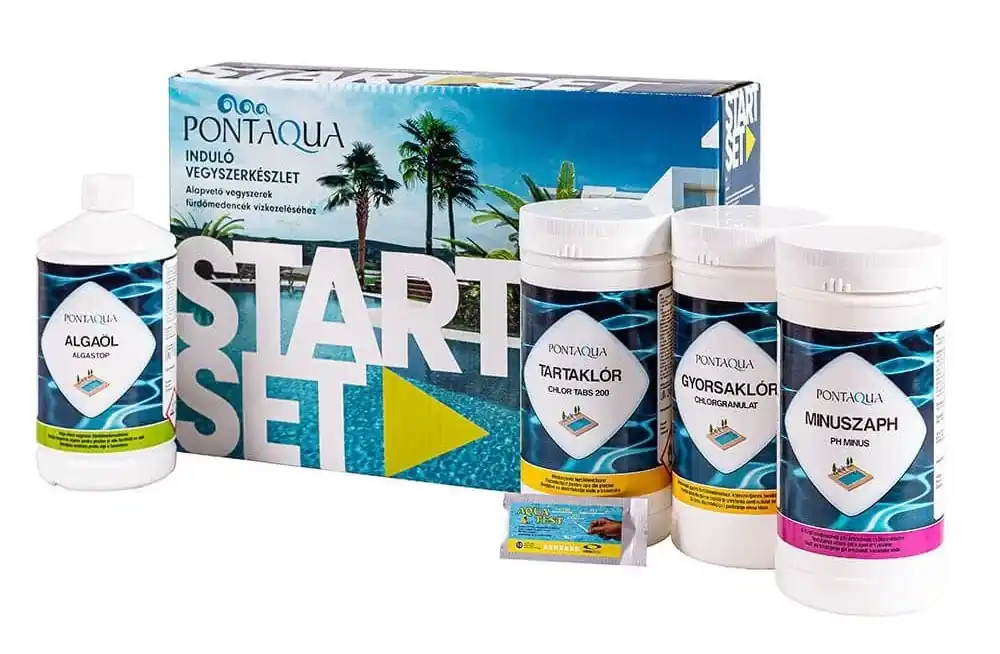 Induló vegyszerkészlet medencékhez A készlet alapvető vegyszereket tartalma fürdőmedencék vízkezeléséhezA készlet tartalma:Gyorsklór: felhasználásával elvégezhetünk egy kezdő klórsokkot, amivel fertőtlenítjük a vizet. Gyorsan oldódik, minden baktériumot elpusztít. 1 kg Nátrium-diklór-izocianurát 97,5%. 100 g termék biocid anyag tartalma 97,5 g.Tartaklór: folyamatos, medence térfogat, illetve szabad-klór tartalom szerinti adagolásával fenntarthatjuk a víz tisztaságát. Lassan oldódó klórtabletta. 1 kgTriklórizocianursav 99 %. 100 g termék biocid anyag tartalma 99 g.Algaöl: segít megelőzni az alga és a különféle gombák, spórák megtelepedését a vízben és a medence falán, gépészetében. 1 literalkil-dimetil-benzil-ammónium-klorid 10%. 100 g termék biocid anyag tartalma 10 g.MinuszapH: segítségével beállíthatjuk a víz pH értékét. Ez a hazai vizekben jellemzően magas, ezért csökkenteni szükséges, de előtte mindenképp mérjük meg, majd törekedjünk, hogy 7,2-7,6 között legyen egész szezonban. 1.5 kg Nátrium-hidrogén-szulfát 100 %Aquachek: vízelemző, amivel megmérhetjük a víz kémiai jellemzőit, így pontosan adagolhatjuk a vegyszereket, a kívánt értékek beállításához.>>>Ide kattintva még többet olvashat a medence kezeléséről