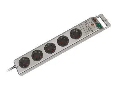 Kapcsolós 5 részes elosztó túlfeszültség védelemmel. Ennek az aljzatsornak az a különlegessége, hogy a kábel bevezetés a kapcsolóval szemközti végen van elhelyezve Ebből adódik az ügyes kezelhetősége, pl. akár az íróasztal alatt. A beépített túlfeszültség védelem véd az elektromos hálózatból jövő veszélyes túlfeszültségektől. 2 pólsú be-/kikapcsoló és felfüggesztő berendezés, amivel falra szerelésre is alkalmas.
