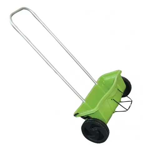 Műanyag szórókocsi 12 liter űrtartalommal vetőmag, műtrágya és só számára.